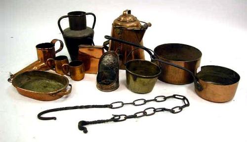 A GROUP OF COPPER AND BRASS COOKING ITEMS; Including a kettle, saucepans, chamber stick, spit jack and more, worn, 8 pieces