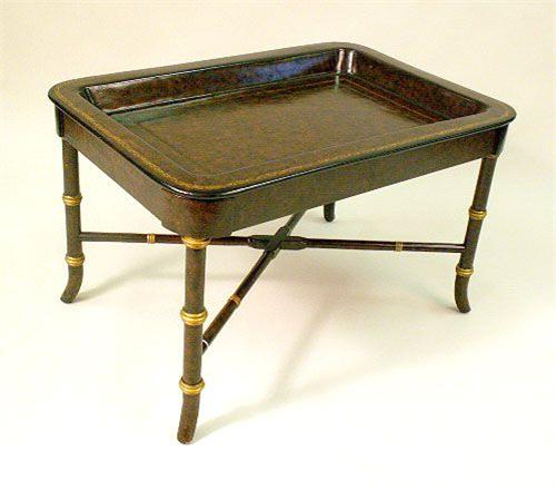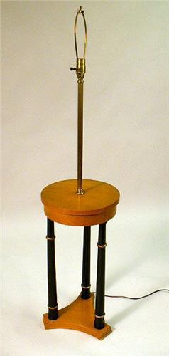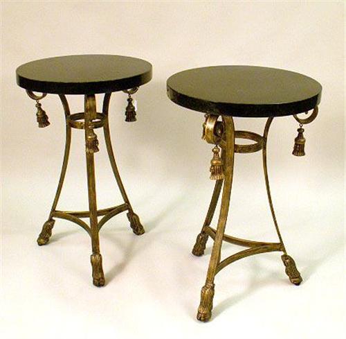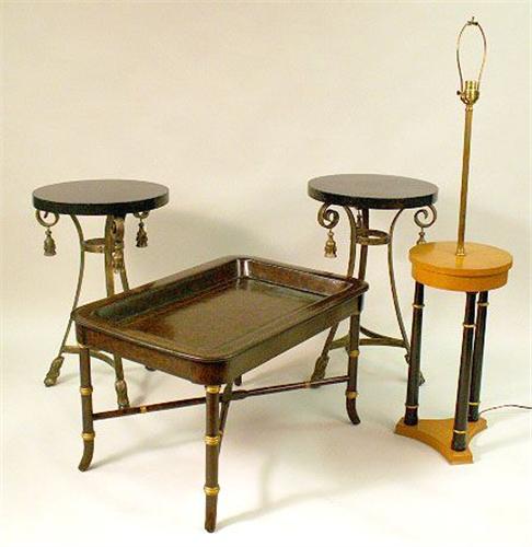 Comprising a pair of faux stone bouillotte tables, a Regency style parcel gilt burlwood tray on stand, and a Biedermeier style ebonized and parcel gilt maple lamp stand. 4 pieces.
