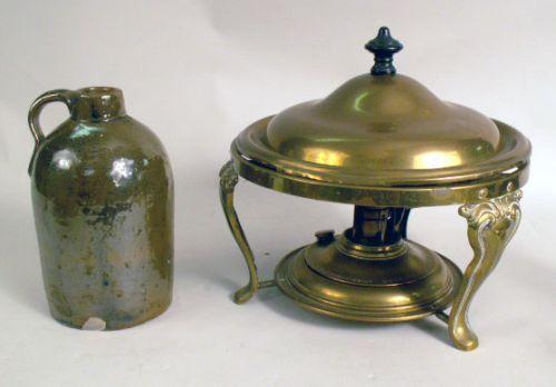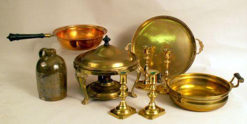 Including a small stoneware jug, 8"h, a pair of baluster form brass candlesticks, 6"h, and a pair of brass candlesticks.