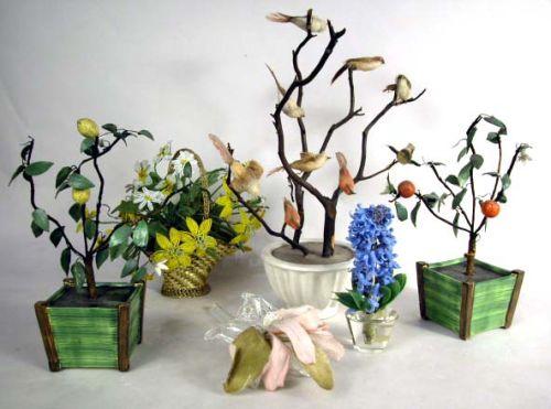 A GROUP OF DECORATIVE POTTED FLOWERS AND BIRDS; Together with a mirror on tray