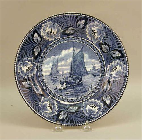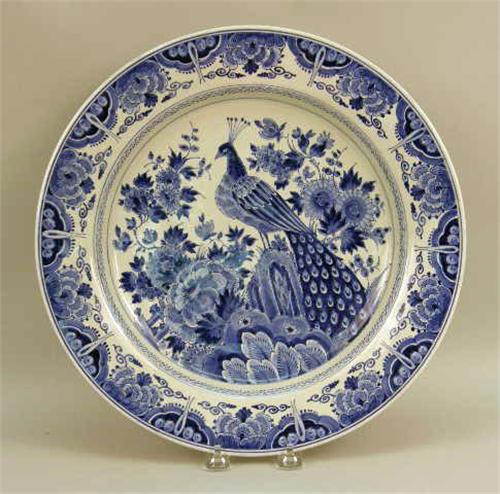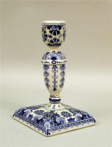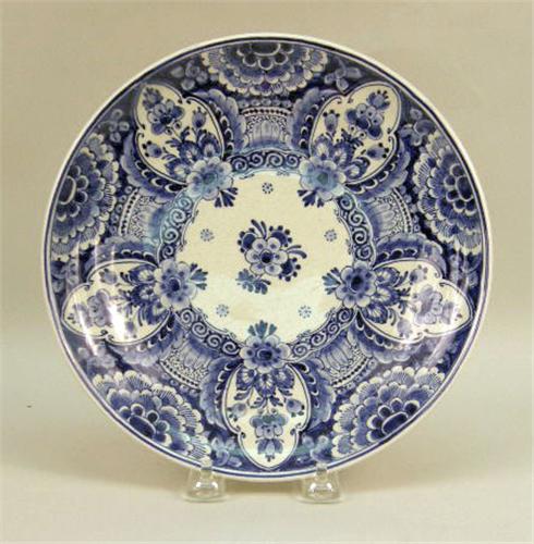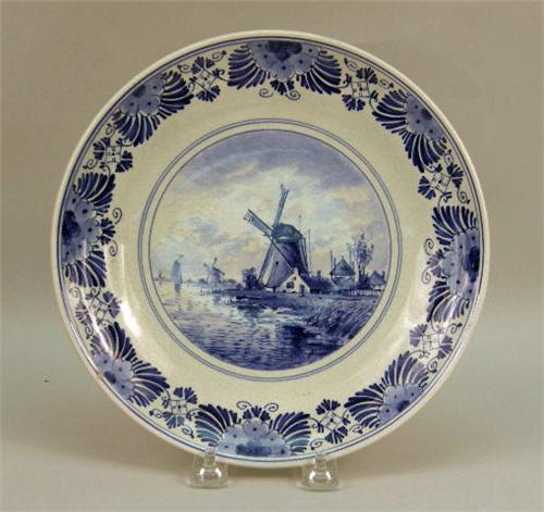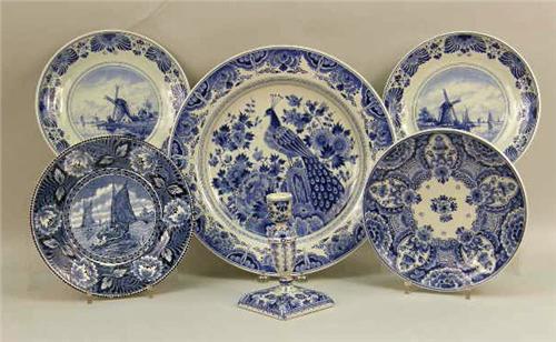 Comprising a large serving platter, three plates and a candlestick, all marked "Delft". Together with a blue and white plate marked "Ceramique Maastricht". 6 pieces. The serving platter 13"dia.