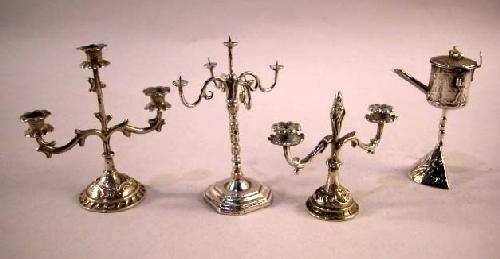 A GROUP OF DUTCH NINETEENTH CENTURY STERLING SILVER MINIATURES; Comprising: three candelabrum, and an oil lamp, 2-3/4"h