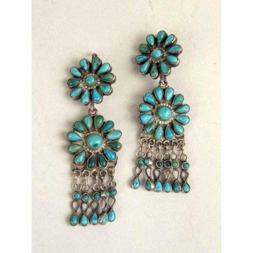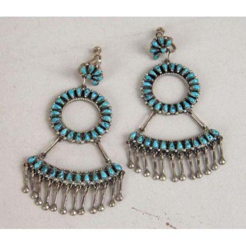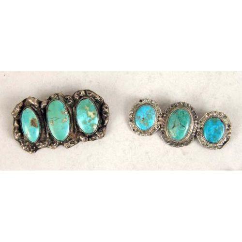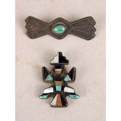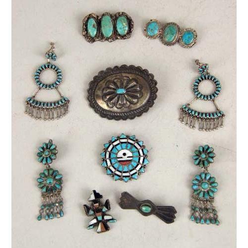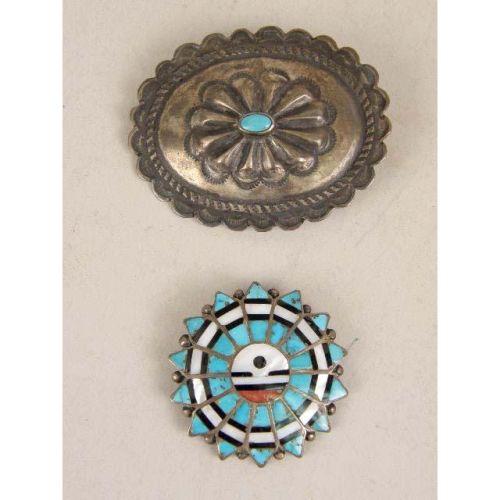 A GROUP OF EARLY NAVAJO AND ZUNI SILVER TURQUOISE AND CORAL JEWELRY<BR><BR>Including 2 Zuni pins, 2 Navajo pins with bezel-set turquoise, and a concho as a pin, 2-3/4"long
