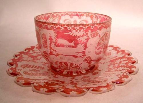 A GROUP OF EIGHT ACID ETCHED CRANBERRY TO CLEAR FINGER BOWLS AND UNDER PLATES; Animal and foliate motif bowls 4 3/4" dia plate 9" dia