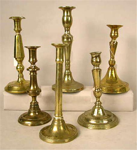 A GROUP OF EIGHT ASSORTED CAST-BRASS CANDLESTICKS; probably English, several lacking ejector mechanisms, otherwise average wear, 8 pieces, tallest 12" h