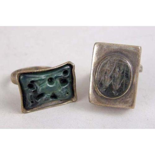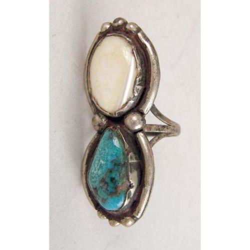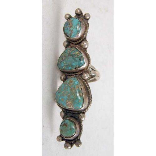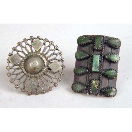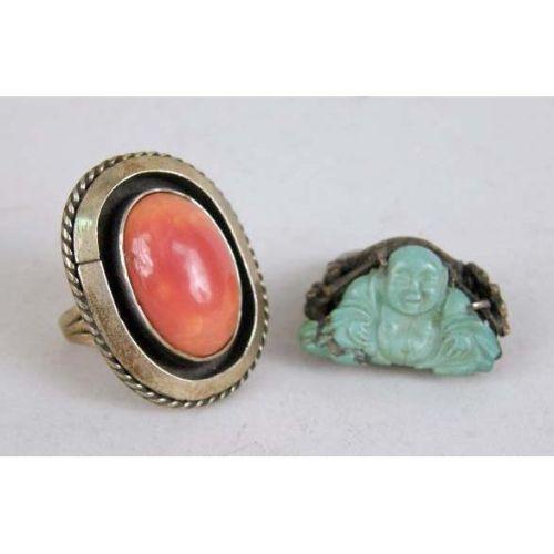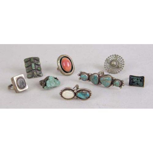 A GROUP OF EIGHT EARLY SILVER HAND-WROUGHT RINGS<BR><BR>Including a Navajo bezel-set turquoise nugget, 3"long, and an oval coral cabochon, 1-3/4"long