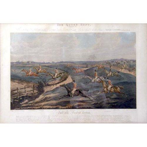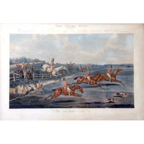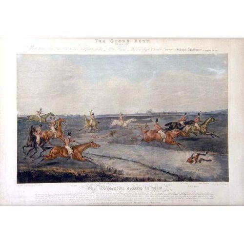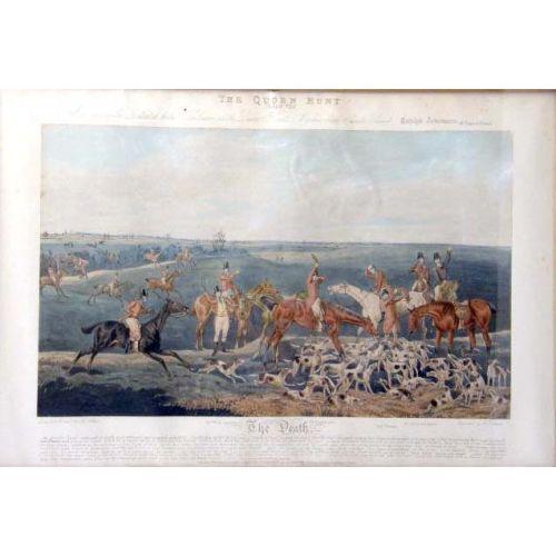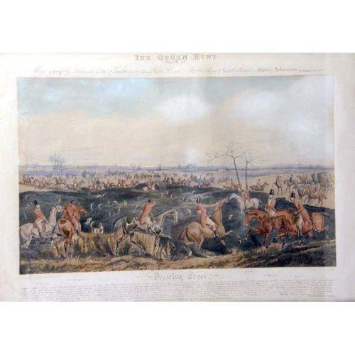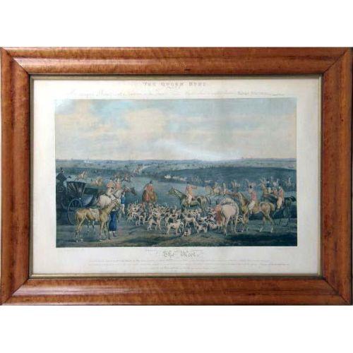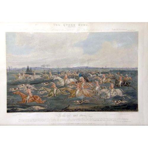 A GROUP OF EIGHT FRAMED POLYCHROME ENGRAVINGS<BR><BR>Depicting hunt scenes from "The Quorn Hunt," including titles "" "The Meet," "Drawing Cover," "Tally-Ho and Away," "Full-cry Second Horses," "Snob is Beat," "The Pace Begins to Tell," "The Whifsendine appears in View," and "The Death," Foxing, 16-3/4"h x 24"w