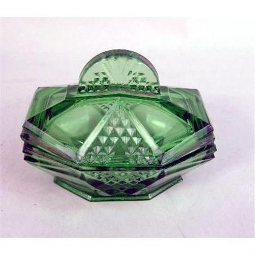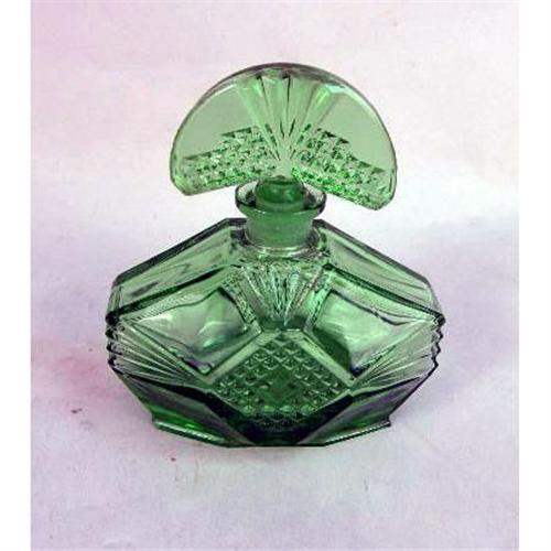 A GROUP OF EMERALD GREEN COLORED GLASS DRESSER ARTICLES<BR><BR>Purchased in Czechoslovakia, comprising, an atomizer, a perfume with stopper, and a covered box, chips, 4 3/4"h