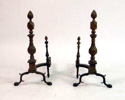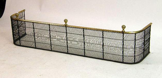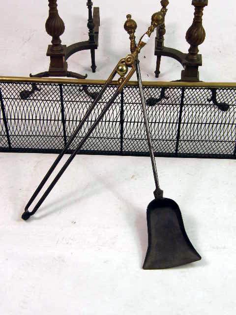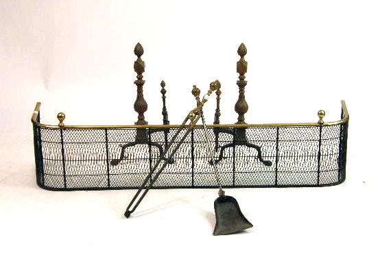 Comprising a brass and wrought-iron fender, a pair of flame-finial andirons, a shovel, a pair of tongs, and two wall hooks. 7 pieces.