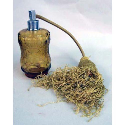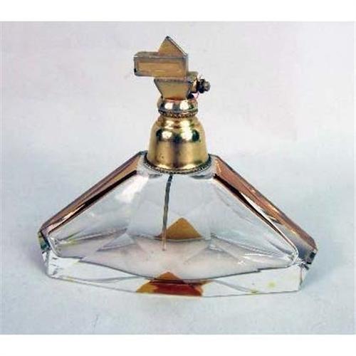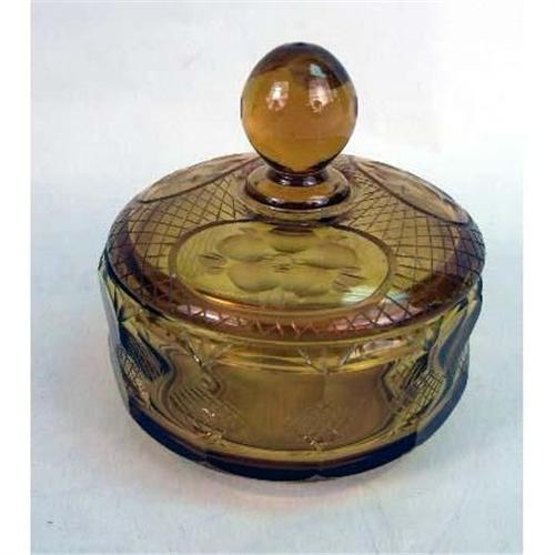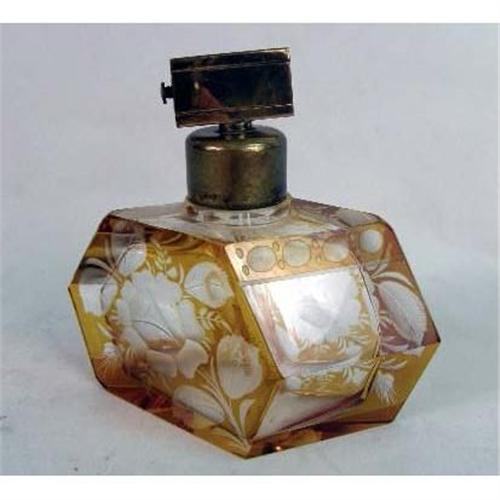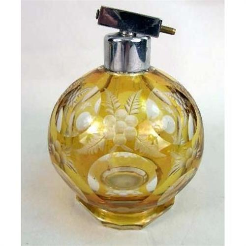 A GROUP OF FIVE AMBER AND COLORLESS GLASS DRESSER ARTICLES<BR><BR>Purchased in Czechoslovakia, Comprising, four atomizers and a covered jar, wear