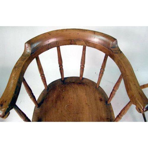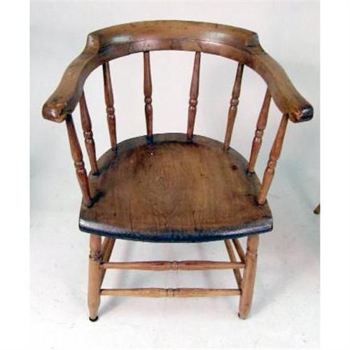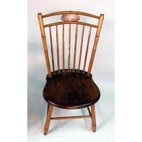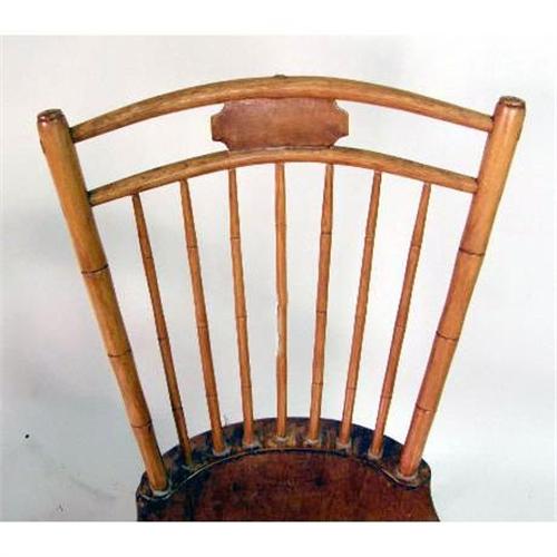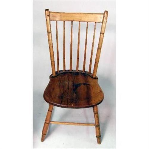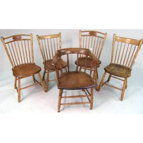 A GROUP OF FIVE AMERICAN COUNTRY SPINDLE BACK CHAIRS<BR><BR>Comprising: two pairs of plank seat bamboo turned spindle back side chairs, and a firehouse barrel back armchair. Provenance, all from the Hoover family homestead in Ohio