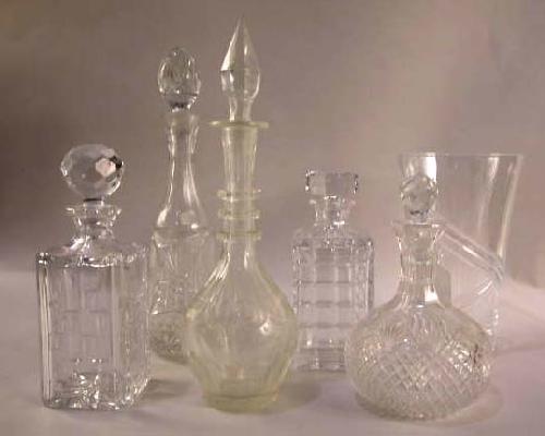 A GROUP OF FIVE ASSORTED COLORLESS GLASS DECANTERS; Together with a swirl form, acid etched vase