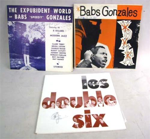 A GROUP OF FIVE AUTOGRAPHED RECORDS Comprising Babs Gonzales' "The Expubident World of Babs 'Speedy' Gonzales featuring the 8 Killers of Modern Jazz", Praque Chorar's "Alcione", Babs Gonzales' "Presenting Babs Gonzales with Arrangements by Melba Liston and voices of the Modern Sounds", Les Double Six's "Les Double Six", and "Thad Jones, Mel Lewis, and Manuel De Sica and The Jazz Orchestra", wear