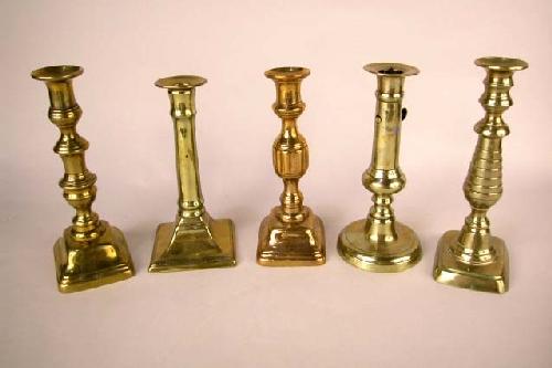 A GROUP OF FIVE BRASS AND BELL METAL CANDLESTICKS, ENGLISH; Tallest 9"h