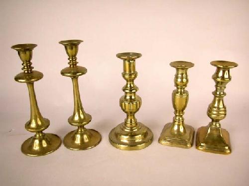 A GROUP OF FIVE BRASS CANDLESTICKS, ENGLISH; Three single candlesticks and one pair