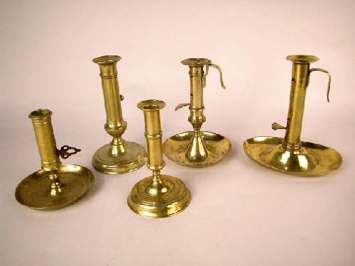 A GROUP OF FIVE BRASS PUSH EJECT CHAMBERSTICKS, ENGLISH Tallest 7 1/2"h