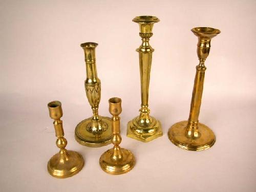 A GROUP OF FIVE CANDLESTICKS, CONTINENTAL; One pair and three singles, Tallest 16"