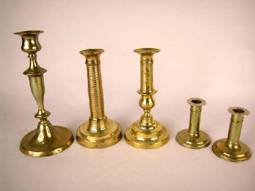 A GROUP OF FIVE CANDLESTICKS, CONTINENTAL; One pair and three singles, Tallest 7 1/4"h