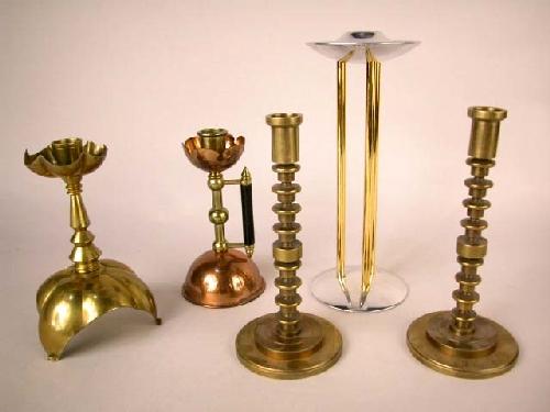 A GROUP OF FIVE CANDLESTICKS; including a pair of brass spool-form candlesticks
