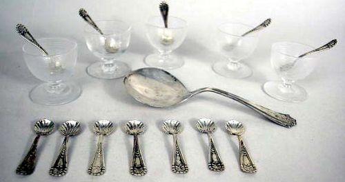 A GROUP OF FIVE GLASS FOOTED SALTS WITH TWELVE STERLING SILVER SALT SPOONS; Together with a sterling silver bonbon spoon, 5-1/2"l