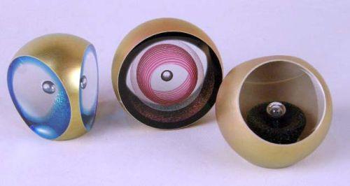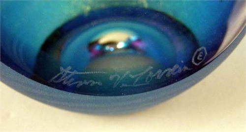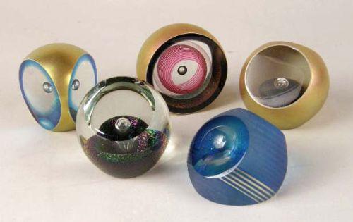 A GROUP OF FIVE IRIDESCENT GLASS PAPERWEIGHTS