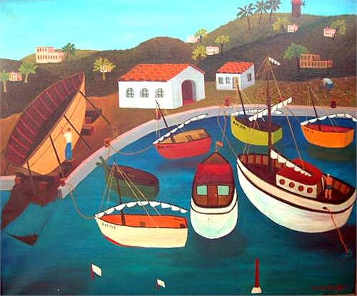 A GROUP OF FIVE NAIVE WORKS DEPICTING SUB-TROPICAL SCENERY; By G. Valdes, Martha Counihan, Raisa, Charles Orloff, and G. Leveque largest 19 1/2"h x 23 1/2"w 5 pieces
