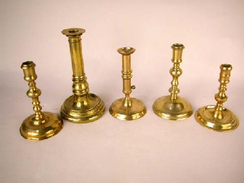 A GROUP OF FIVE ROUND BASE BRASS CANDLESTICKS, ENGLISH