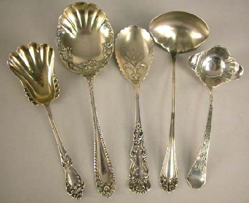 A GROUP OF FIVE STERLING SILVER SERVING PIECES; Comprising: two ladles, longest 7-3/4"l, and three scalloped bowl servers, apx. 7 T.O.