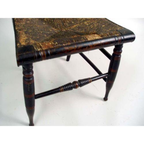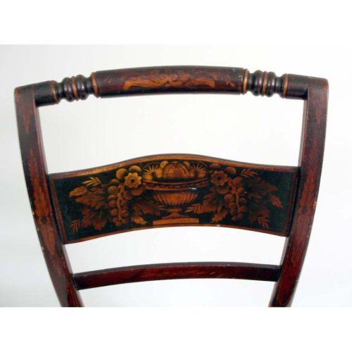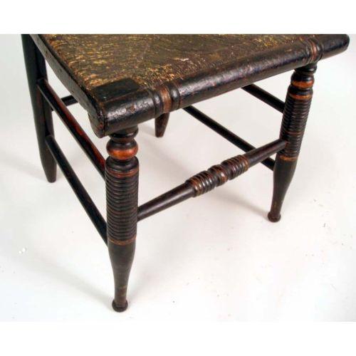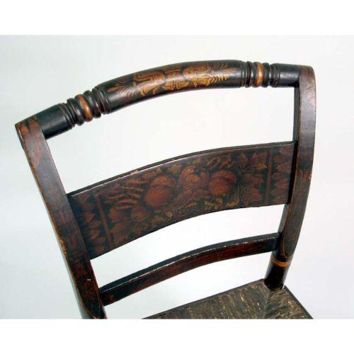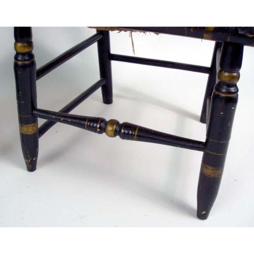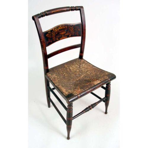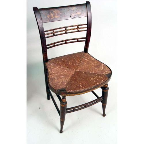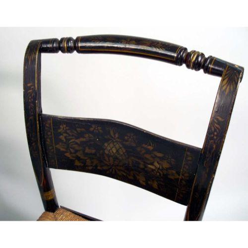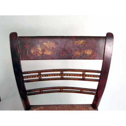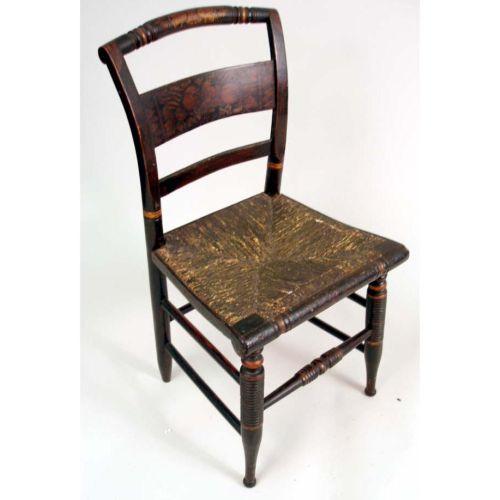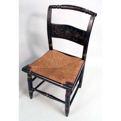 A GROUP OF FOUR ASSORTED JAPANNED AND STENCILED FANCY CHAIRS<BR><BR>probably New York or New England. Some with painted rush seats, one cut down. The tallest 34" high. 4 pieces.