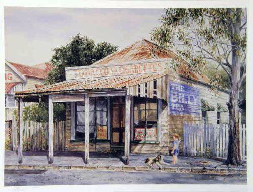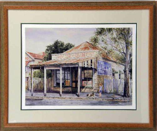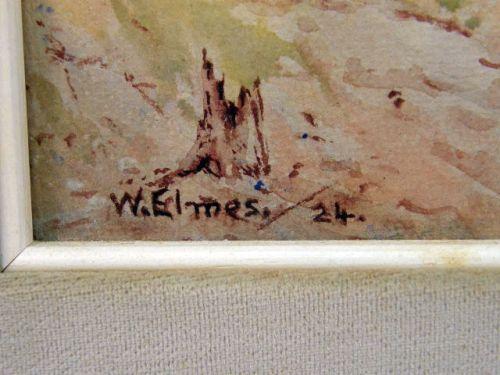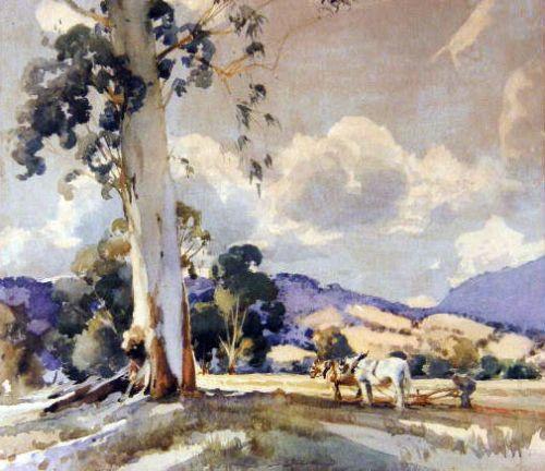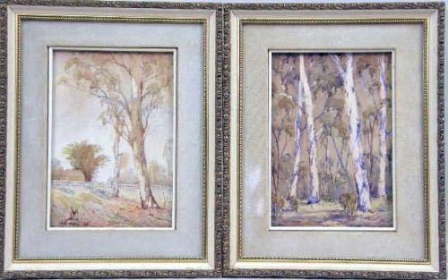 Comprising a watercolor on paper of a landscape with farmer and horse, signed l.r. H.S. Power, a pair of watercolors of Australian landscapes, signed l.l. W. Elmes `24, and a print of a Brisbane country street scene signed l.l. G.K. Hanley (Gordon Hanley, Australian). 14"h x 16 1/2"w, 9 1/2"h x 6 1/2"w, and 19"h x 25"w