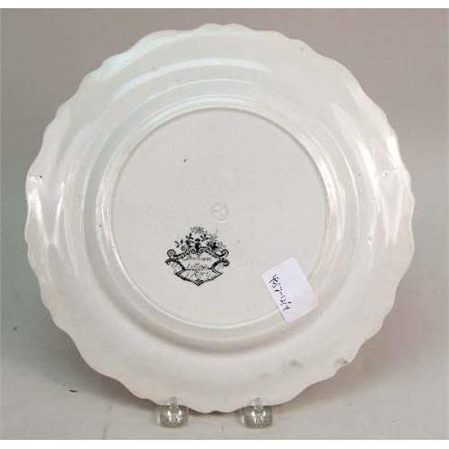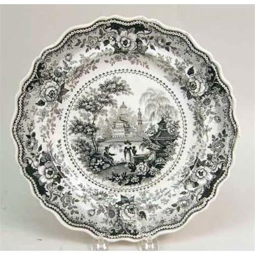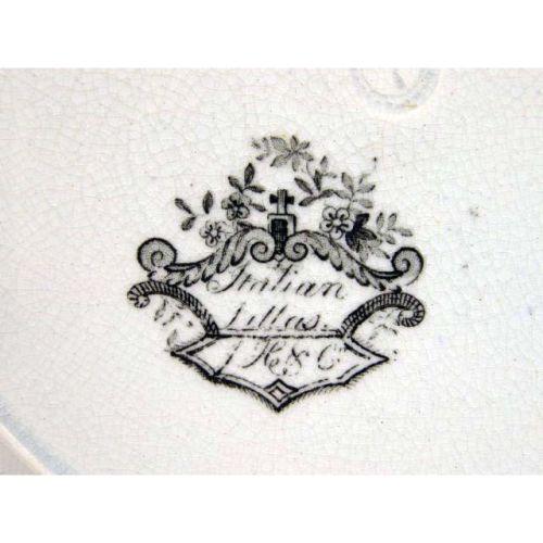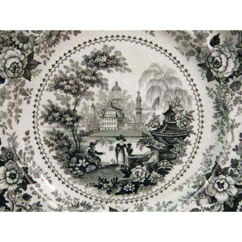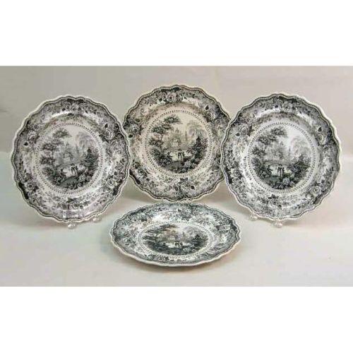 A GROUP OF FOUR BLACK AND WHITE TRANSFER DECORATED PLATES<BR><BR>Stamped underside, "Italian Villas," craquelure and discoloration, 10 1/2"dia.