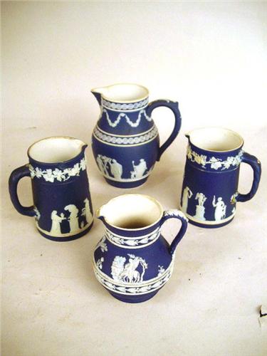 A GROUP OF FOUR BLUE JASPERWARE WEDGWOOD CREAM JUGS