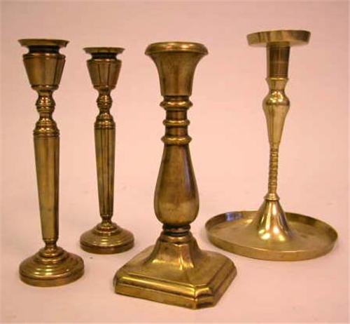 A GROUP OF FOUR BRASS CANDLESTICKS, CONTINENTAL; A pair and two singles, Tallest 9 1/2"h