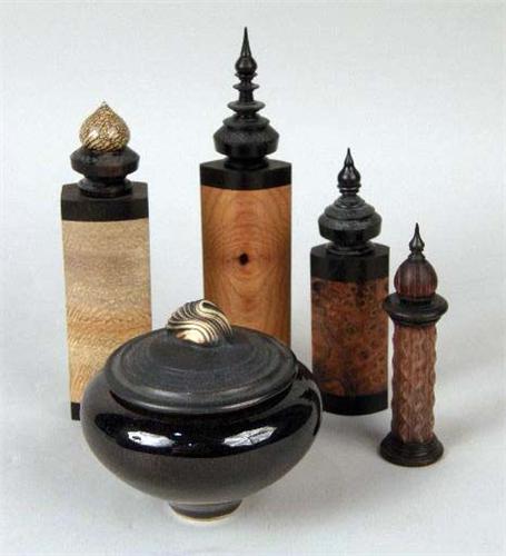 Signed underside "John Lauer," Together with an earthenware covered box, 7"l. 5 pieces