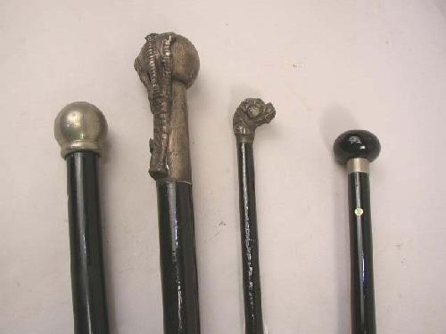 A GROUP OF FOUR EBONIZED WALKING STICKS; One with a pug head handle, another decorated with a bird foot, the other two with spherical knobs