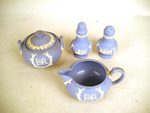 A GROUP OF FOUR LIGHT BLUE JASPERWARE WEDGWOOD SALT, PEPPER, SUGAR, AND CREAMER