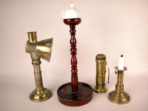 A GROUP OF FOUR LIGHTING DEVICES; Including a Continental brass traveling light, and a French brass kerosene light 8 1/4"h and 9"h