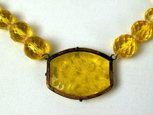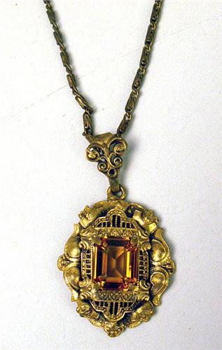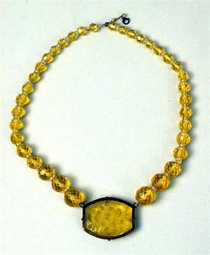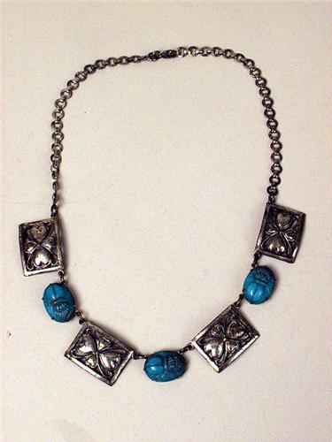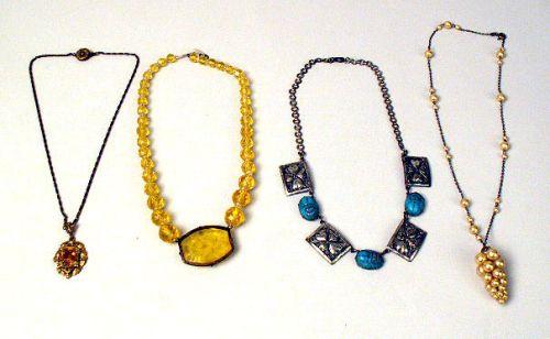 Comprising a silver tone and turquoise scarab, 16"l, a yellow faceted crystal bead with center floral motif pendant, 16"l, a gold tone chain with pendant, 9"l, and a silver and pearl chain with grape cluster pendant, chain broken, 18"l.