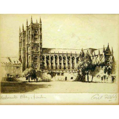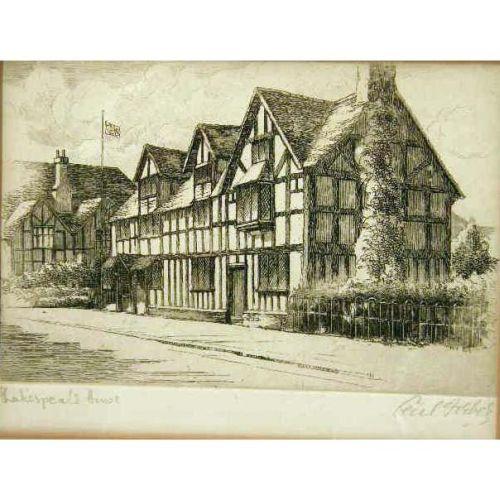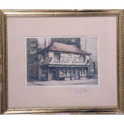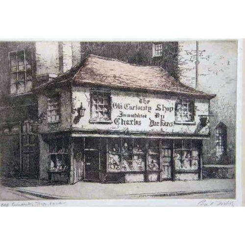 A GROUP OF FOUR ORIGINAL CECIL FORBES ETCHINGS<BR><BR>One of Dickens` "The Old Curiosity Shop." Together with a set of six Charles Dickens` books, including, "David Copperfield," "Great Expectations," "Tale of Two Cities," and "Oliver Twist," published by Collins, London and Glasgow, 1953, and two leather bookends. 13 pieces