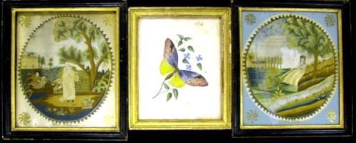 A GROUP OF FOUR PAINTED AND NEEDLEWORK FRAMED WALL HANGINGS; By Mary and Emily Judd, Together with a butterfly watercolor Largest 22"h x 19"w (losses)