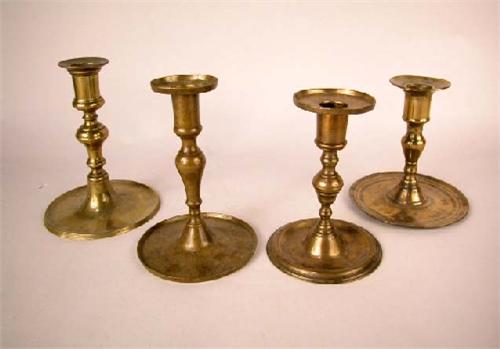 A GROUP OF FOUR ROUND BASE BRASS CANDLESTICKS,CONTINENTAL; Tallest 6 1/2"h