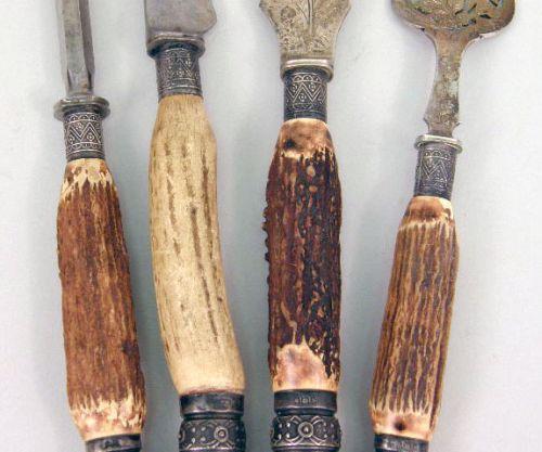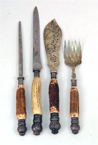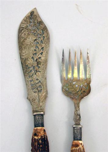 Comprising a two-piece fish serving set, and a carving knife and sharpener. Fish set 14"l , 10 1/2"l