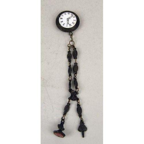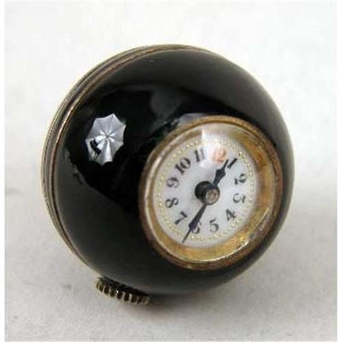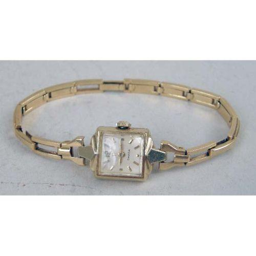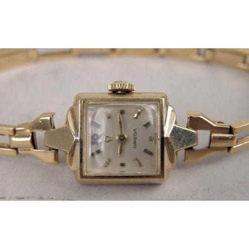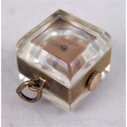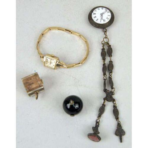 A GROUP OF FOUR WATCHES<BR><BR>Comprising: an Omega 14kt gold filled lady`s wristwatch, an antique black enamel pendant watch, vermeil interior, marked 0.935 Argent Dore 303305, the works with jewels, marked FA SR, a Wyco Raymond Watch Co. Lucite cube-form pendant watch, seven jewels, and a enamel dial watch with fob and chain, together with an 18kt clip missing stone, and misc. small broken pieces and a stamp belonging to Mrs. Hoover "GSH"