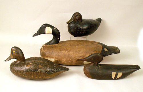 Comprising a black duck, a merganser, a golden eye duck, and a Canadian goose. Varying degrees of age and condition. Largest 21"l.