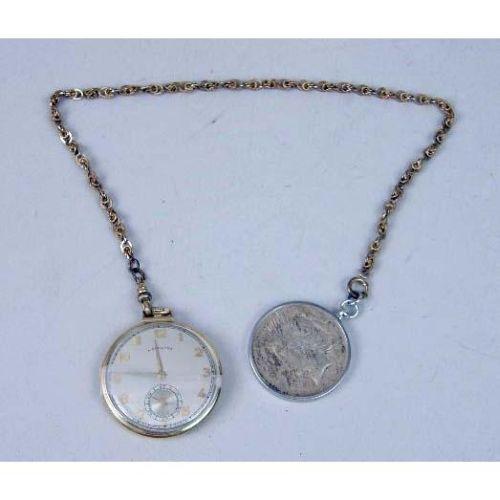 A GROUP OF GENTLEMEN`S WATCHES AND CROSS PEN AND PENCIL SETS<BR><BR>Including a Hamilton gentleman`s open pocket watch, missing crystal, with chain and 1925 silver dollar fob, Tissot Swiss Action Pro pocket watch with leather holder metal chain and mahogany box, a Seiko Kinetic wrist watch, a Seiko Quartz wrist watch and a Pulsar Quartz wrist watch