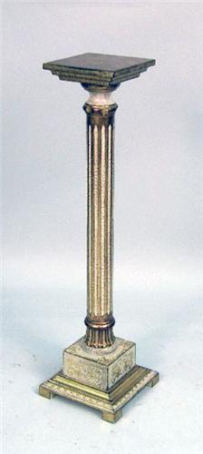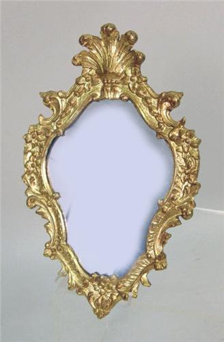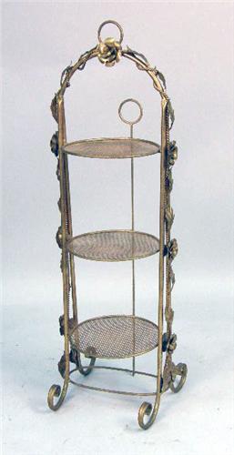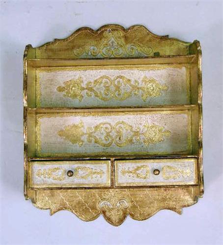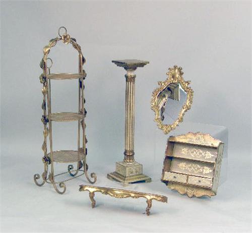 Comprising a Rococo style mirror, a giltwood wall shelf, a pedestal, and three-tiered whatnot shelf. 4 pieces.