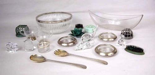 A GROUP OF GLASS AND SILVER PLATE ITEMS; Comprising a cut bowl, five glass figurines, seven coasters, an oval bowl, and floral frogs, and a sugar and creamer