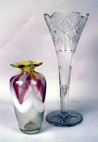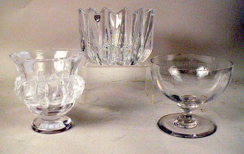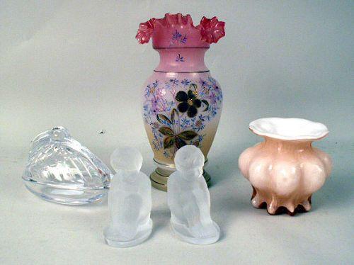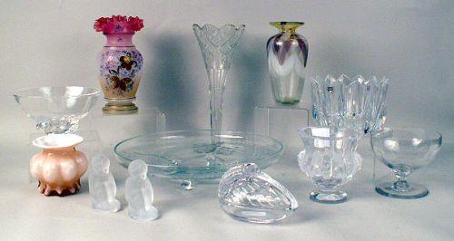 Including a frosted bowl, the underside inscribed Lalique, a colorless bowl inscribed Steuben, a scallop shaped Oreffors bowl, a colored baluster shaped vase inscribed Rainbow Glass Works 80, David R. Bowtin, a pair of frosted glass boy figures, and a pel
