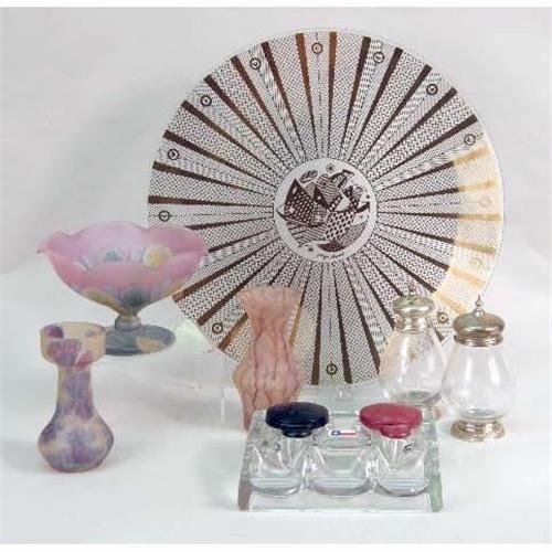 A GROUP OF GLASS TABLE ARTICLES<BR><BR>Including, a desk garniture, three pieces of art glass and platter, 7 pieces