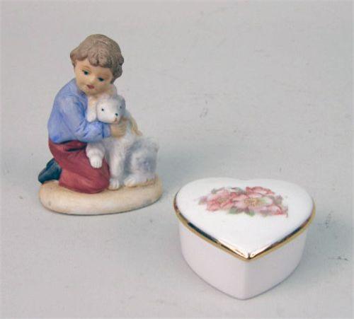 Comprising #131/Street Singer, #132/Star Gazer, #186/Little Fiddler, #124/0 Hello, #57/2/0 Chick Girl. Together with a porcelain "Blue Jay" by Andrea, a porcelain figure of a boy and dog, and a Gerold porcelain heart-shaped covered box. Chip to Street Singer hat, repair to Star Gazer telescope, repair to Hello neck and chip to collar of Jacket.